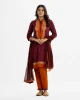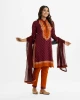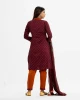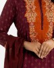 Women’s printed straight salwar kameez in joom fabric. Round neck, three-quarter sleeved. Embroidery and karchupi at the front. Paired with a joom pant pajama and a half-silk dupatta.
